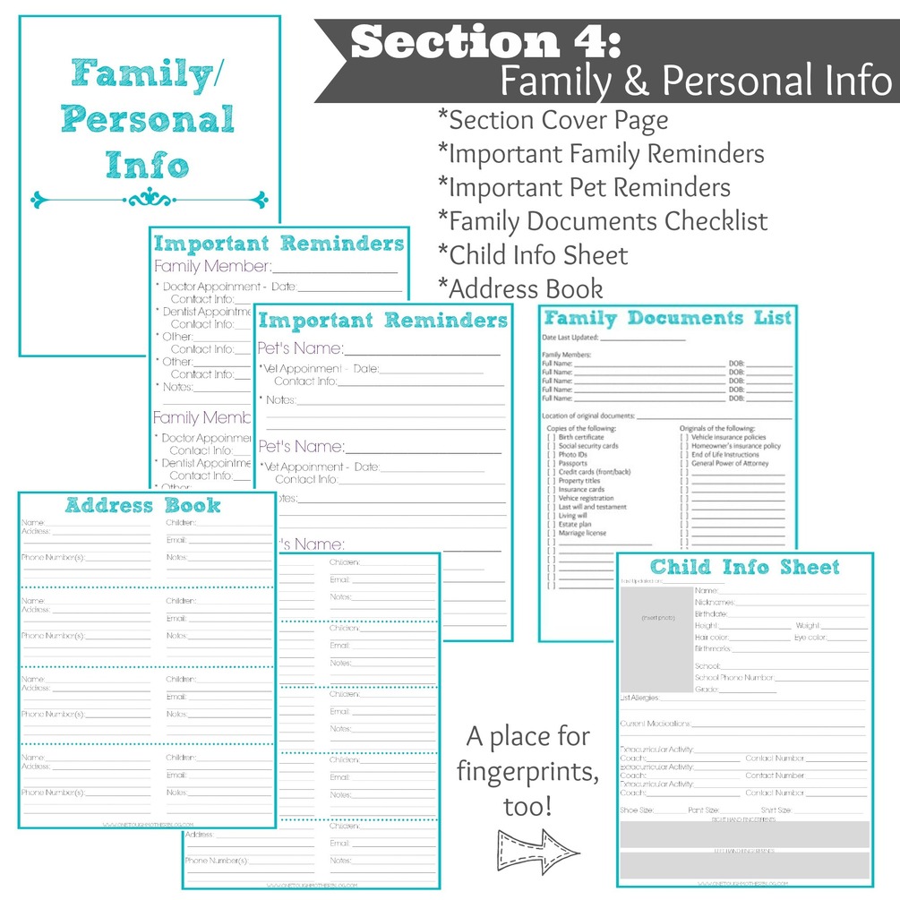 - Family & Personal Info: Family & Pet appointment sheets, child info sheet (with space for child's fingerprints), etc.