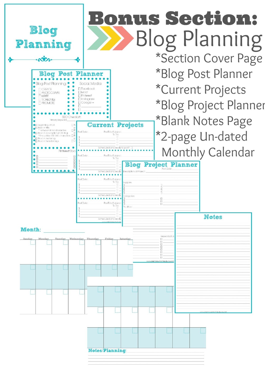 - BONUS Blog Planning: Blog post planner, current project planner, blank calendar sheets, etc.