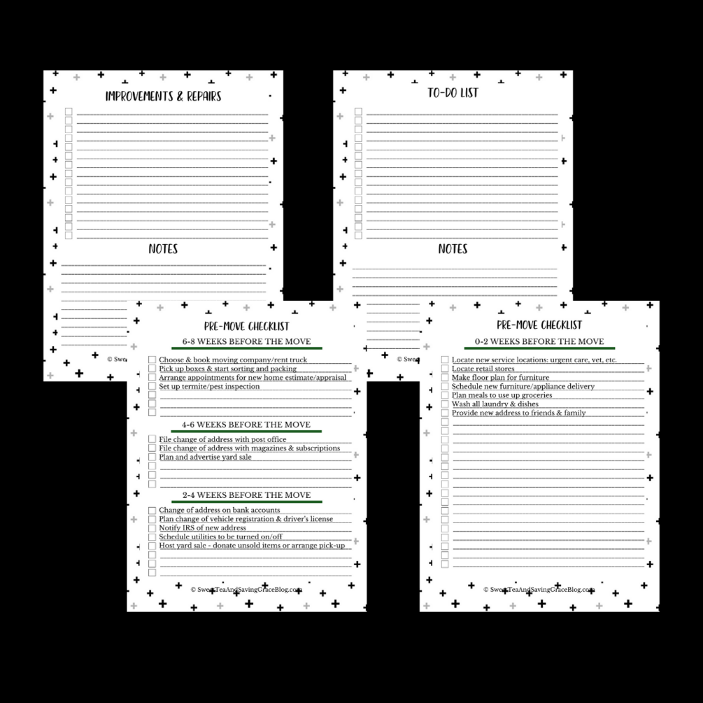 - 2-page Pre-Move checklist: complete with tasks & reminders to do starting 6-8 weeks before your move all the way up to the week of the move